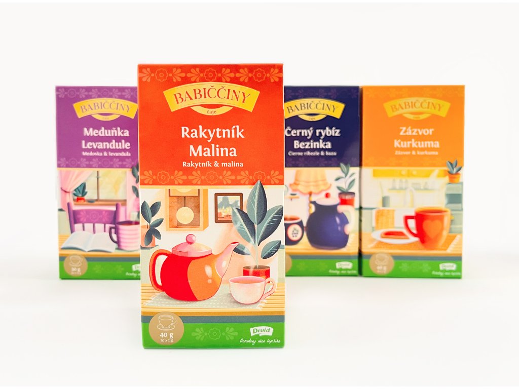 Každá krabička Babiččina čaje je malým pokladem – autorské ilustrace a pečlivě promyšlený design spolu tvoří hřejivý babiččin pokojíček, který tě zve na chvíli klidu a pohody. Stačí zalít, zabalit se do deky a na chvíli zpomalit.