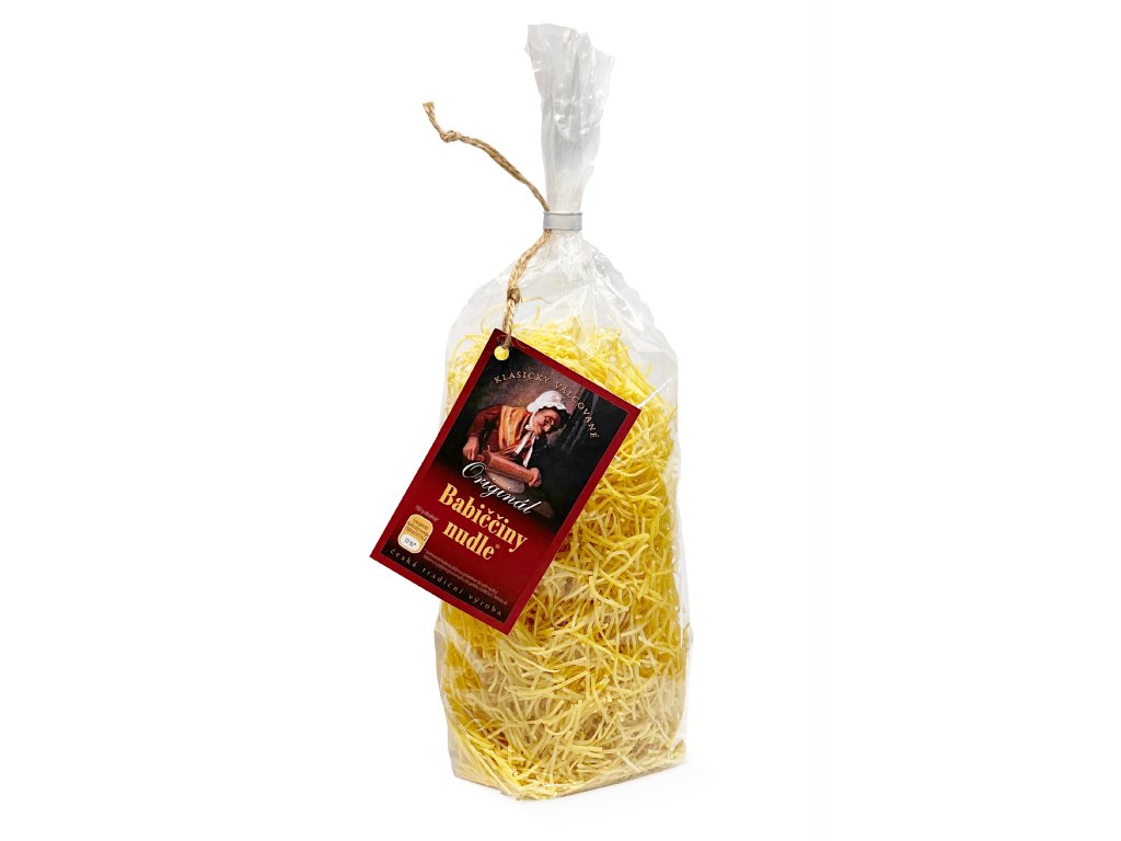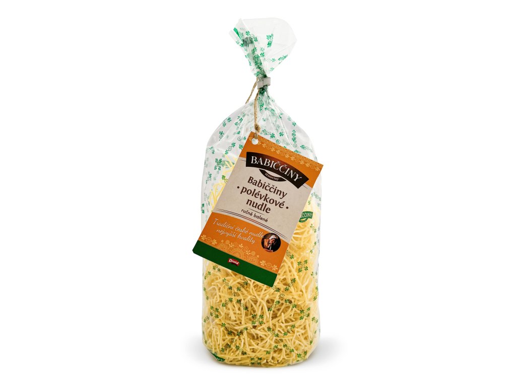 Když se řekne poctivá domácí polévka, nesmí v ní chybět Babiččiny polévkové nudle. Tyto jemné vlasové nudle jsou ručně balené, vyrobené v Jižních Čechách a patří k našim nejoblíbenějším. Díky své tenké struktuře jsou ideální do vývaru – nerozvaří se a polévce dodají tu správnou domácí chuť.